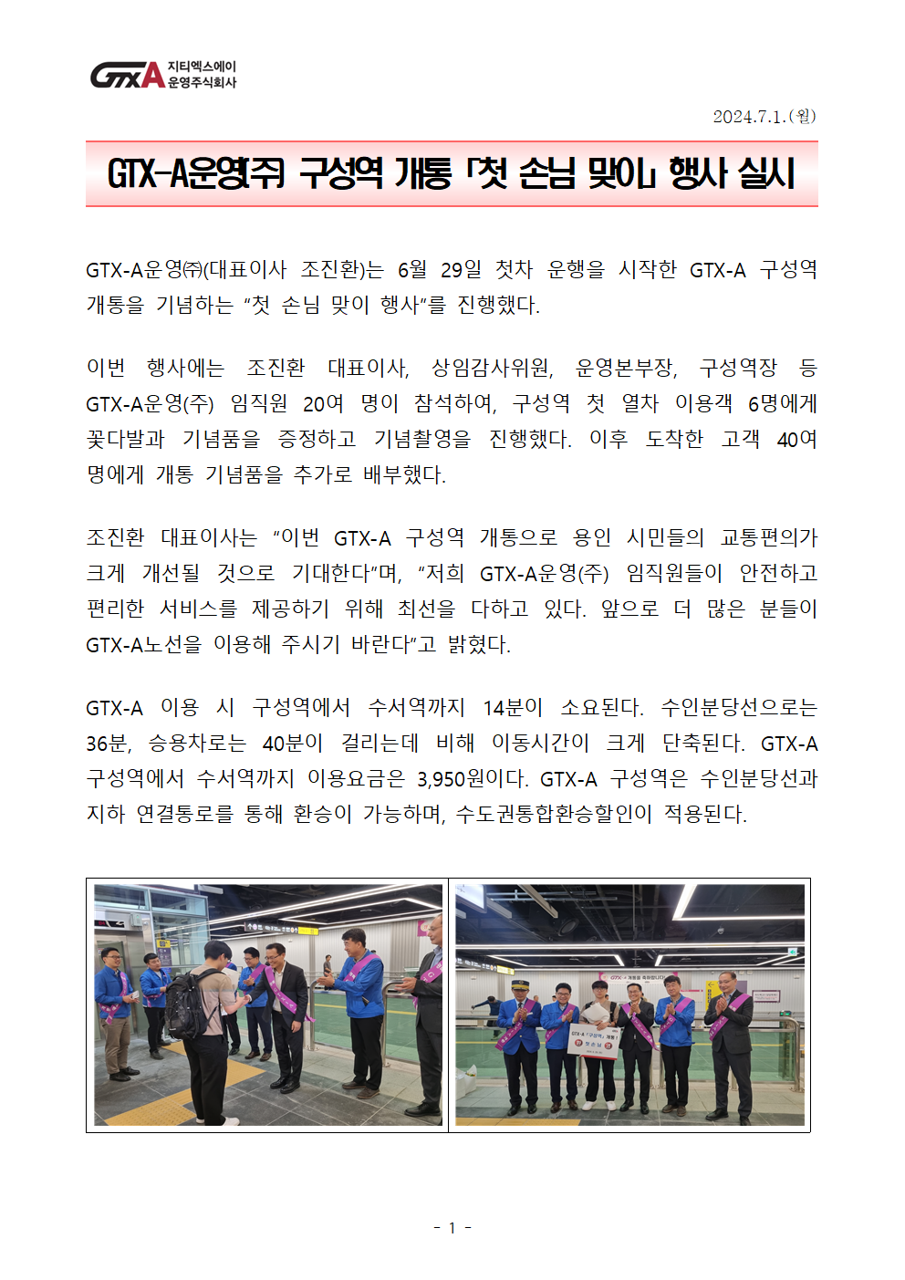 GTX-A운영(주) 구성역 개통「첫 손님 맞이」행사 실시